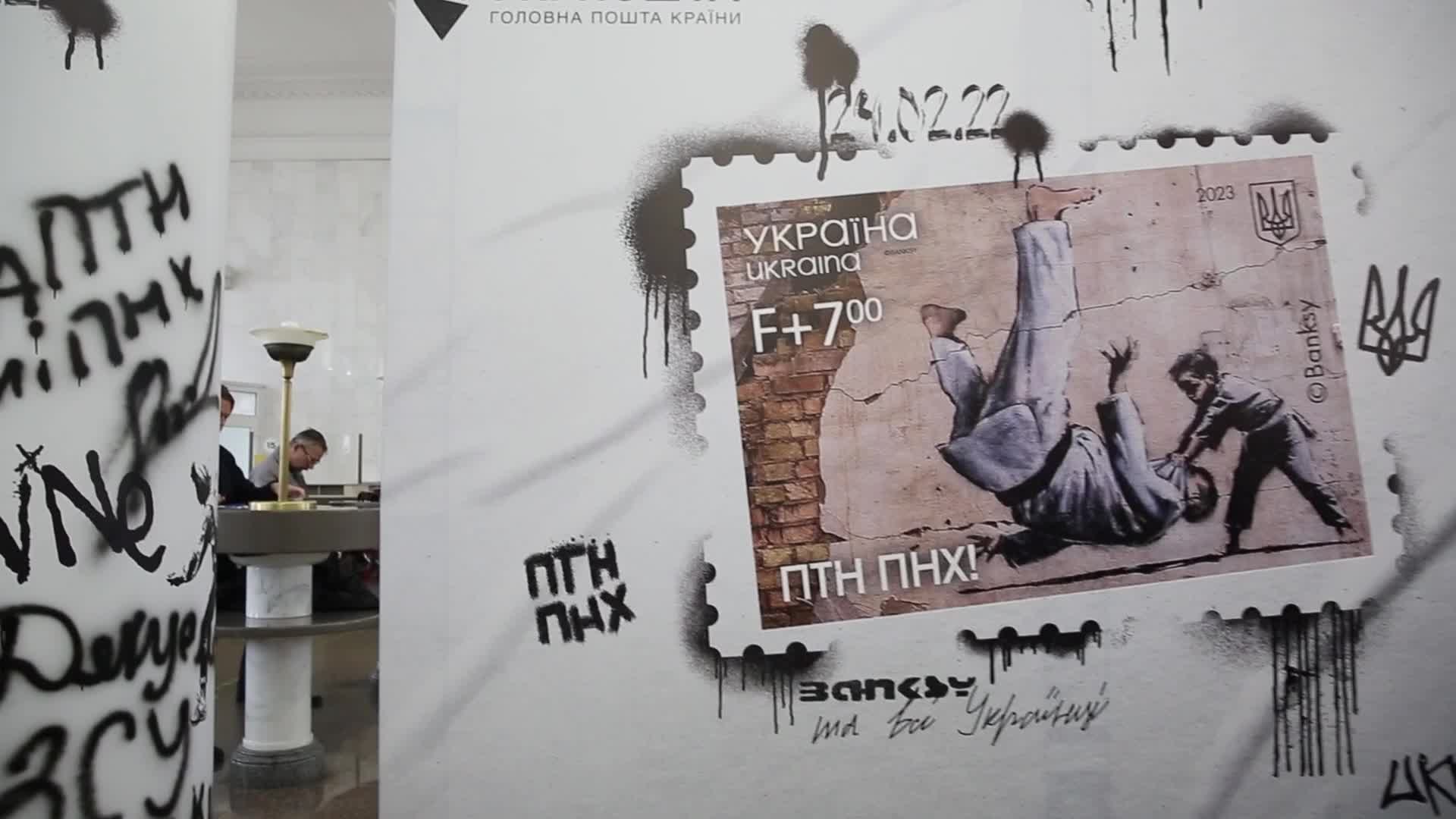 Ukrainian post presents a new “FCK PTN!” stamp in Kyiv, Ukraine