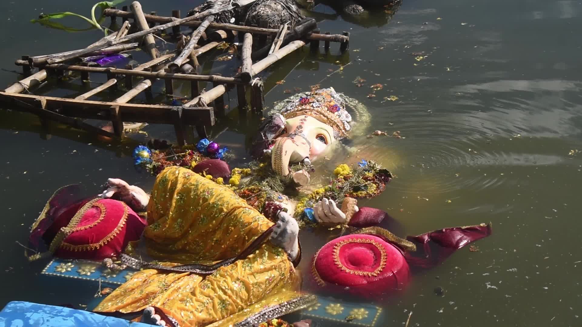 Devotees immerse idols of Lord Ganesh in a river in Kolkata, India