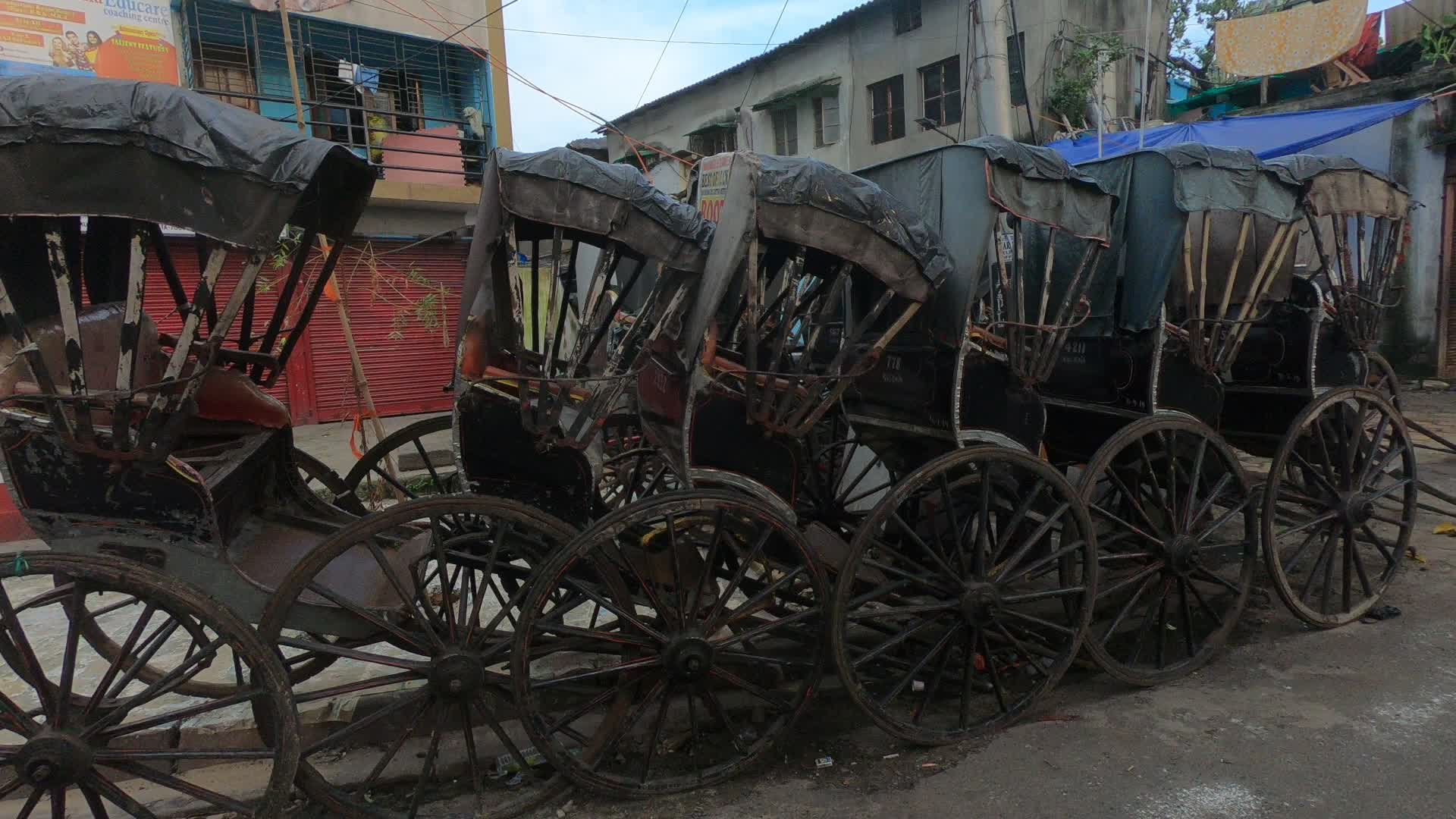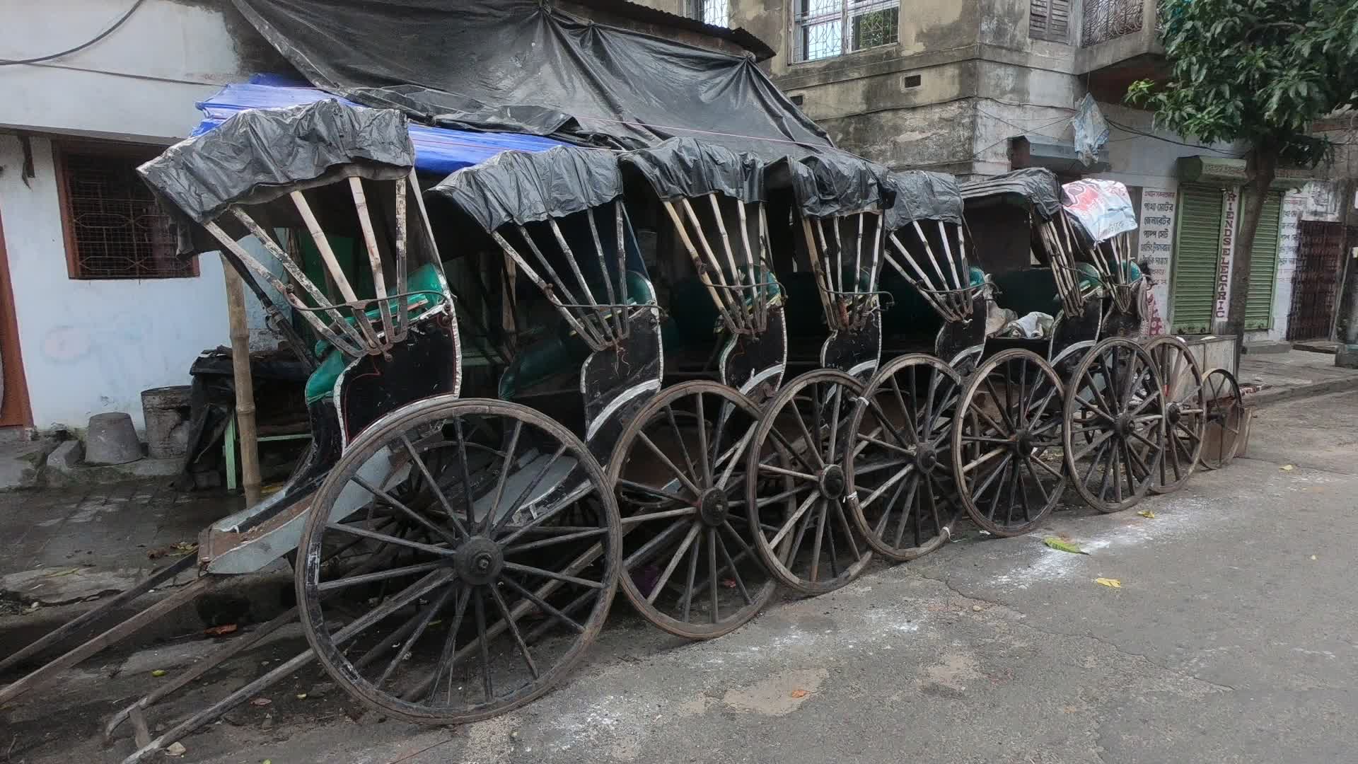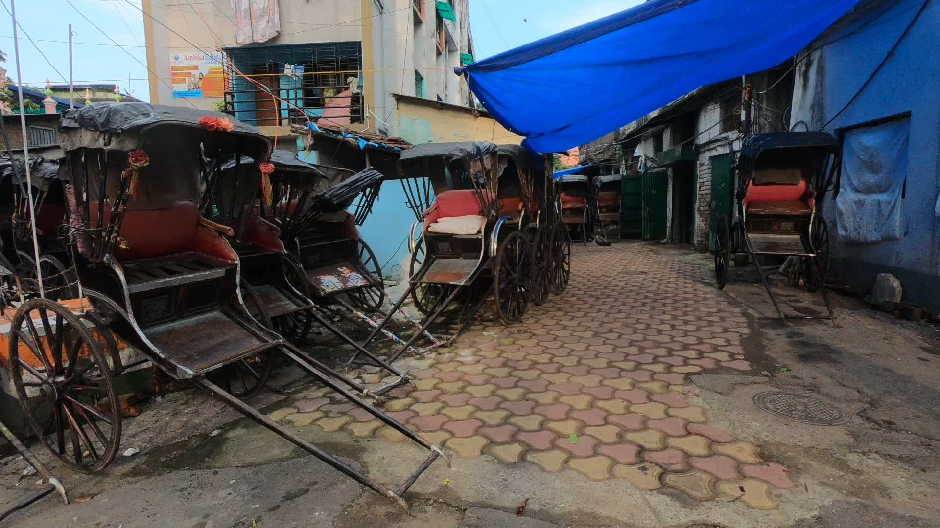 Hand rickshaws are been parked all along a roadside alley in Kolkata