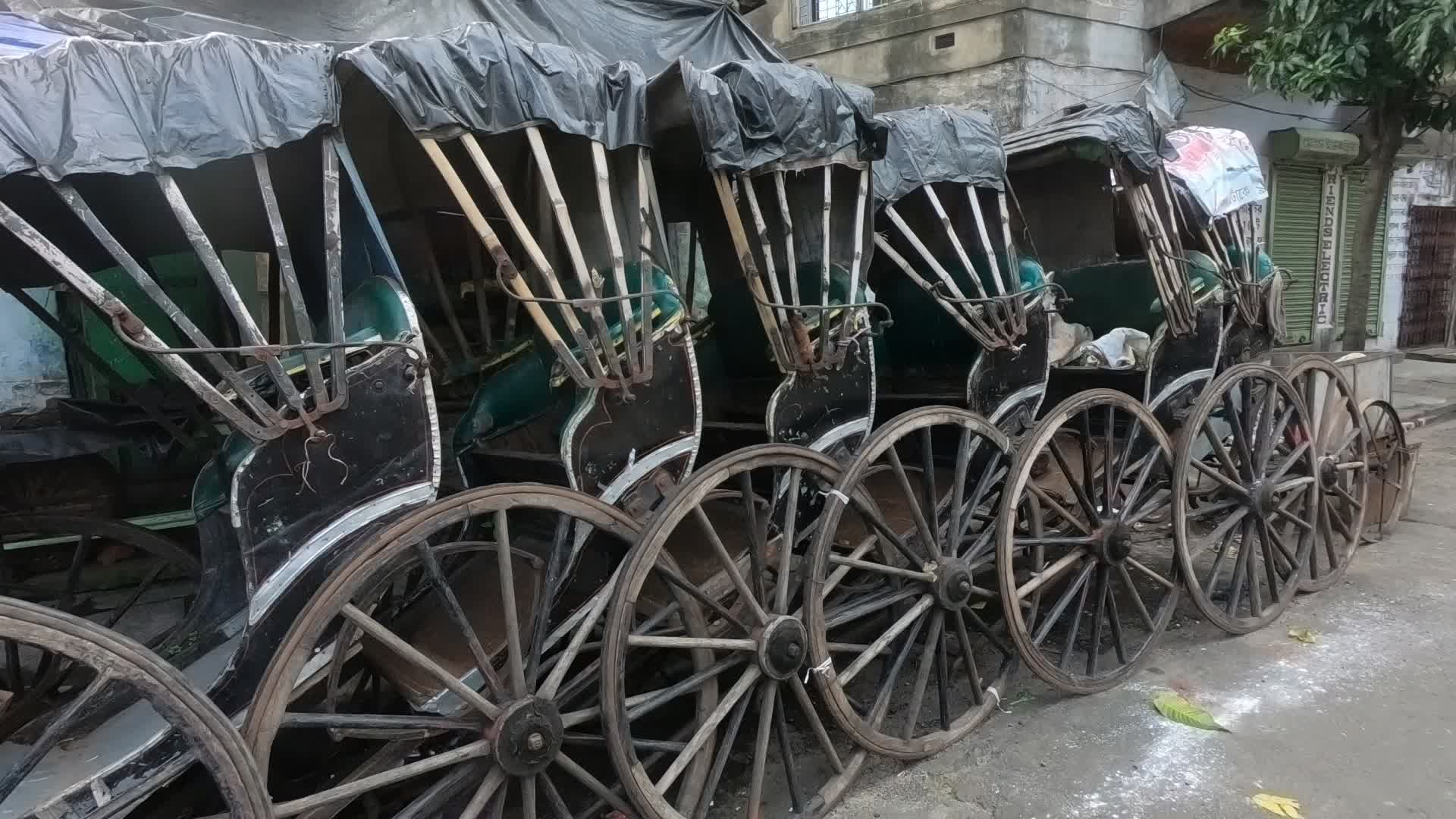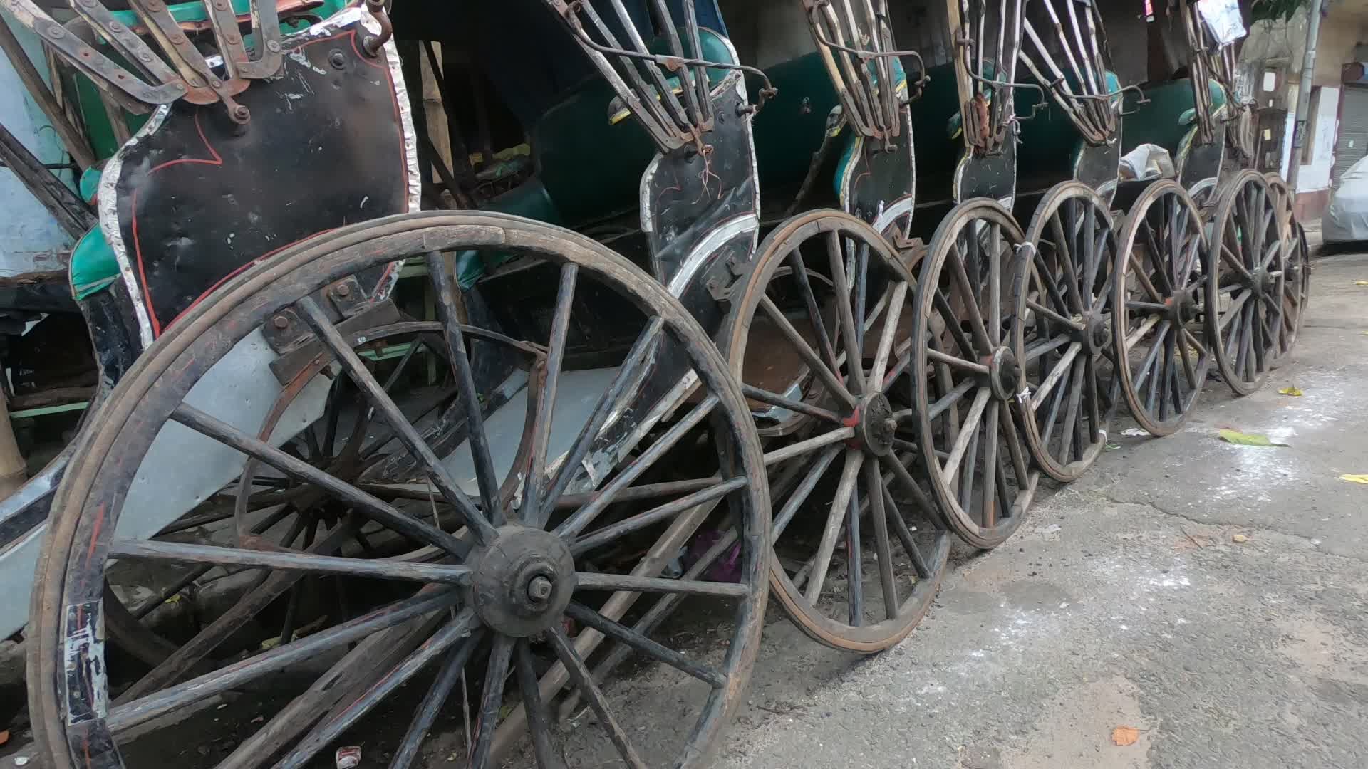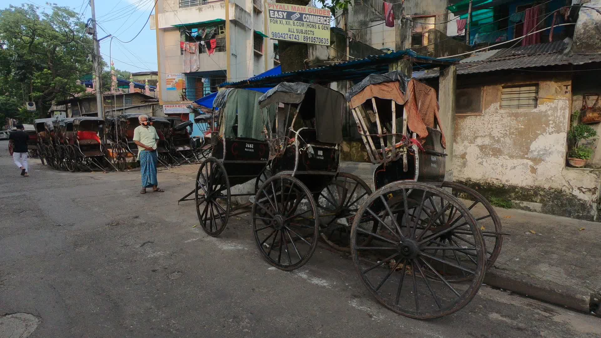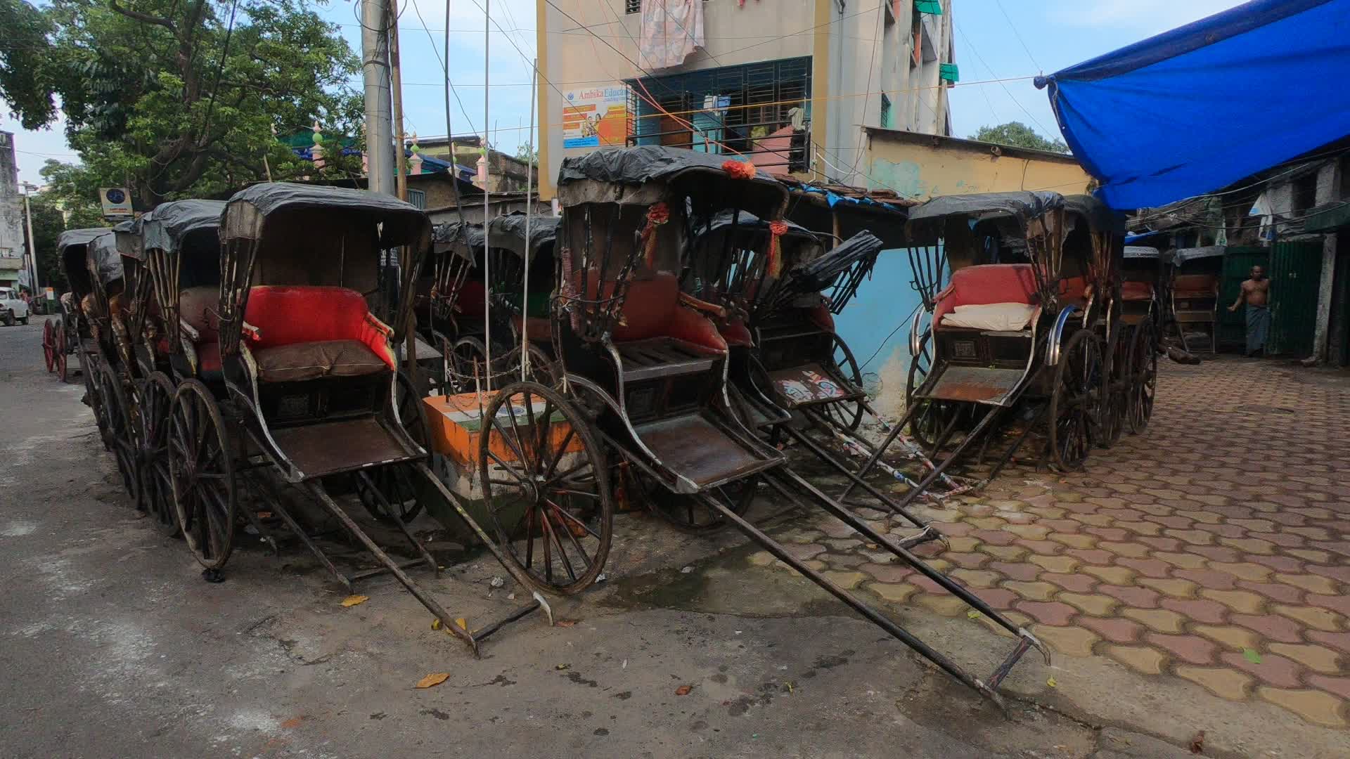 Hand rickshaws are been parked all along a roadside alley in Kolkata
